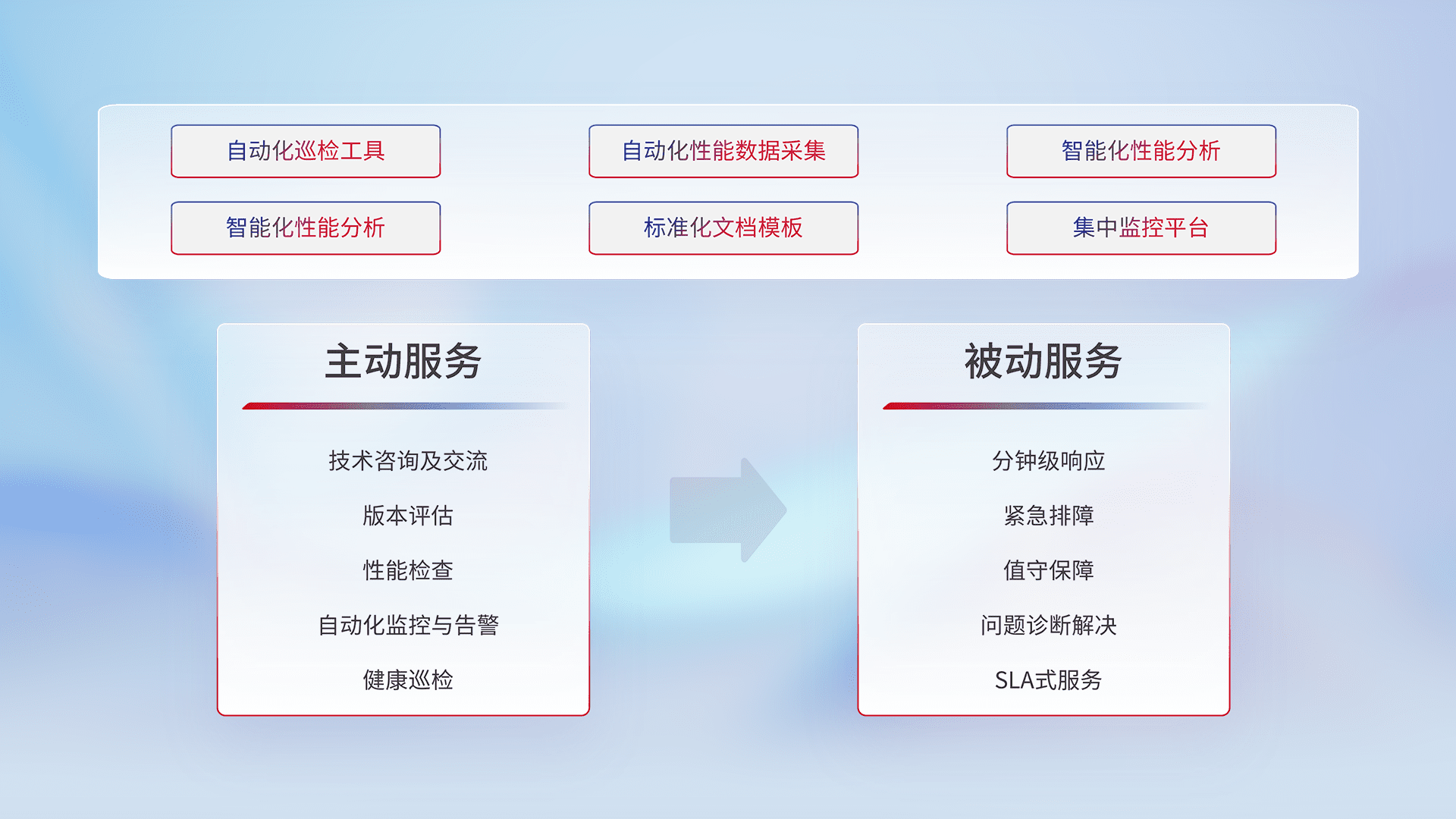 智能化工具和标准化文档,,,保障服务质量,,,提供主动服务(包含技术咨询、、、版本评估、、性能检查、、自动化监控与告警、、、、健康巡检)和被动服务包含(分钟级响应、、、紧急排障、、、值守保障、、问题诊断解决、、SLA服务)。。。